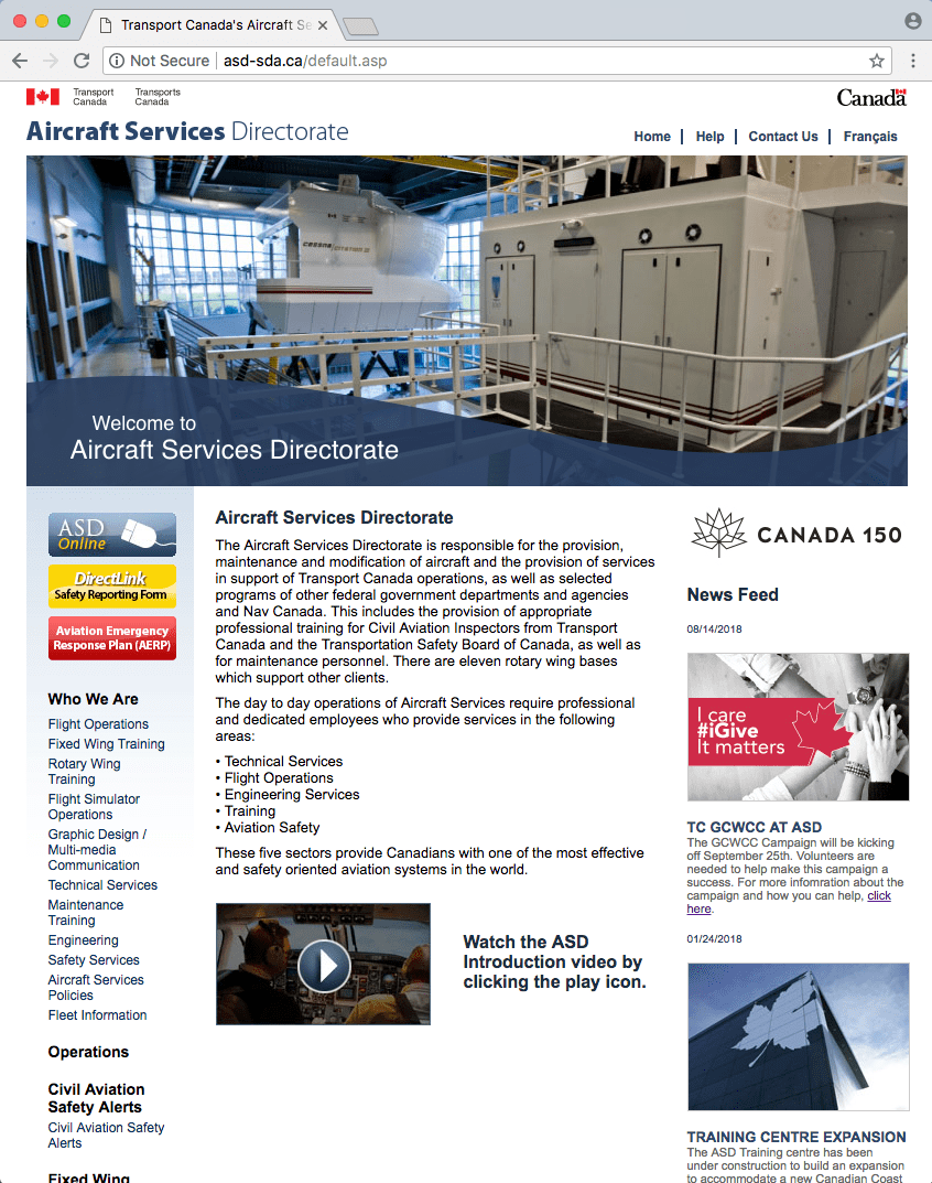 The Aircraft Services Directorate website hosts a variety of aviation-related training material for pilots, inspectors and maintenance engineers employed by Transport Canada, as well as information about ASD as an organization. The goal of the site was to develop the site with the common look and feel of the government, but also have it look different from the typical government website.