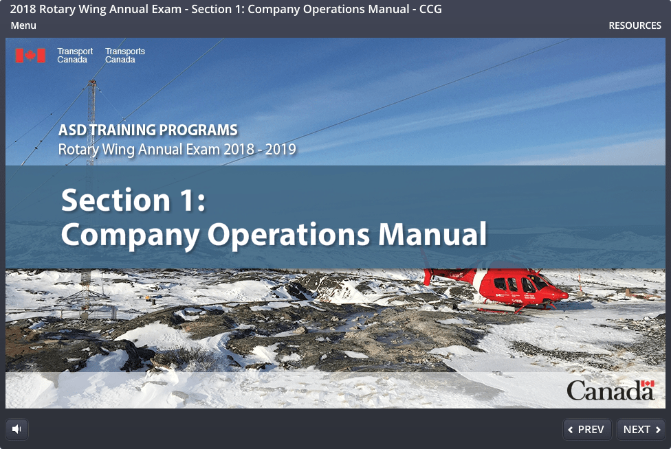 This is an e-learning course template created in Storyline for the Rotary Wing’s recurrent fall exam and training. The course was redesigned last year from its original template to create more compelling visuals and interactions throughout the course. The course was very well received by the students and the client.